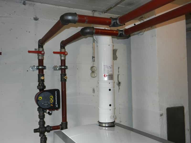 In den bestehenden Kamin wird eine Abgasleitung aus Kunststoff eingezogen. Der Abgangsstutzen für Rauchgas am neuen Heizkessel ist oben positioniert, was gerade bei kleineren Heizungsräumen von Vorteil ist und Zeitgewinn bedeutet.
