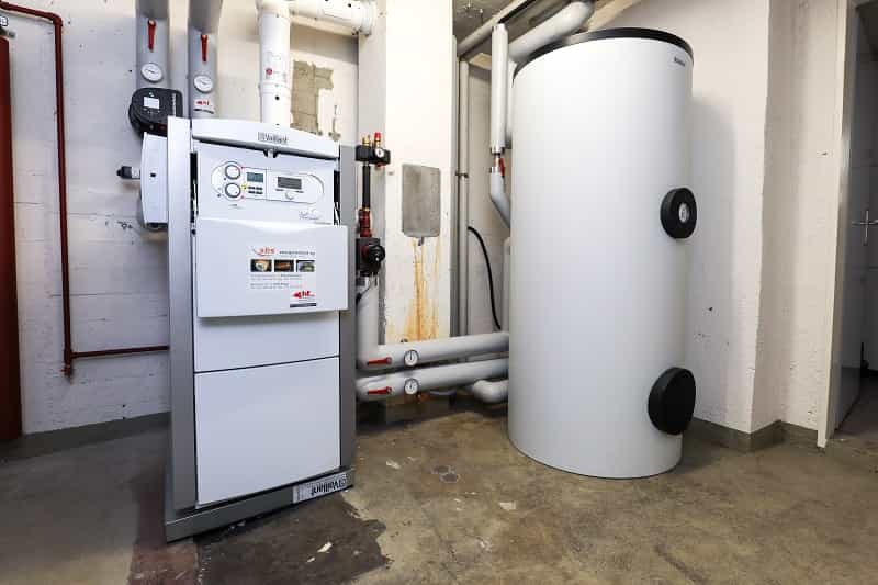 Zuerst musste der alte Heizkessel samt Rohren demontiert und entfernt werden. Auch der Warmwasserspeicher wird bei dieser Gelegenheit durch einen uniSTOR VIH R 500 ersetzt. Diese Speicher sind technisch auf die Wärmeerzeuger von Vaillant abgestimmt und gewährleisten hohe Effizienz. Beim Dokumentierten Objekt hatte sich die Verwaltung für einen Austausch von einer herkömmlichen Öl-Heizung zu einem Gasbrennwertkessel ecoVIT VKK 366/4 von Vaillant entschieden. Da bisher ein Ölkessel für Wärme sorgte, musste das restliche Heizöl aus dem Tank abgepumpt werden. Der Stahltank wird entsorgt und dadurch entsteht wertvoller zusätzlicher Freiraum im Gebäude. Die Gasleitung war bereits vorgängig montiert und das neue Gasgerät musste nur noch angeschlossen werden. Dank geringer Abmessungen konnten die neuen Geräte von Vaillant problemlos in den inzwischen geräumten Heizungsraum eingebracht und installiert werden.